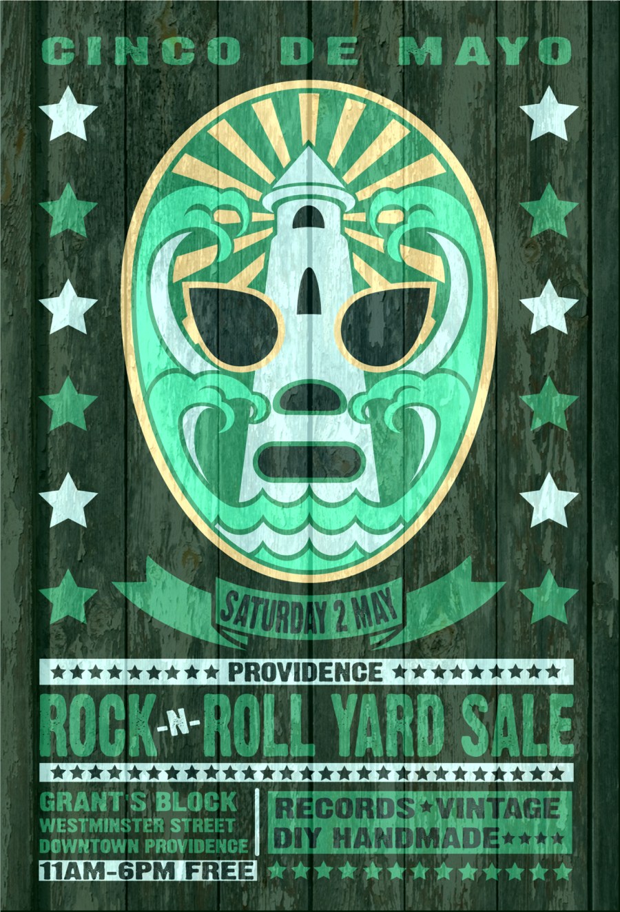 saturday 2nd may 2015 cinco de mayo providence rock and roll yard sale and block party poster designed by uncle pete macphee swampyankee