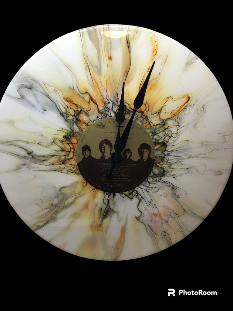 | | hand painted vintage rock and roll vinyl album clocks, acrylic + abstract art on canvas and useful items such as coasters, trivets and jewelry. |