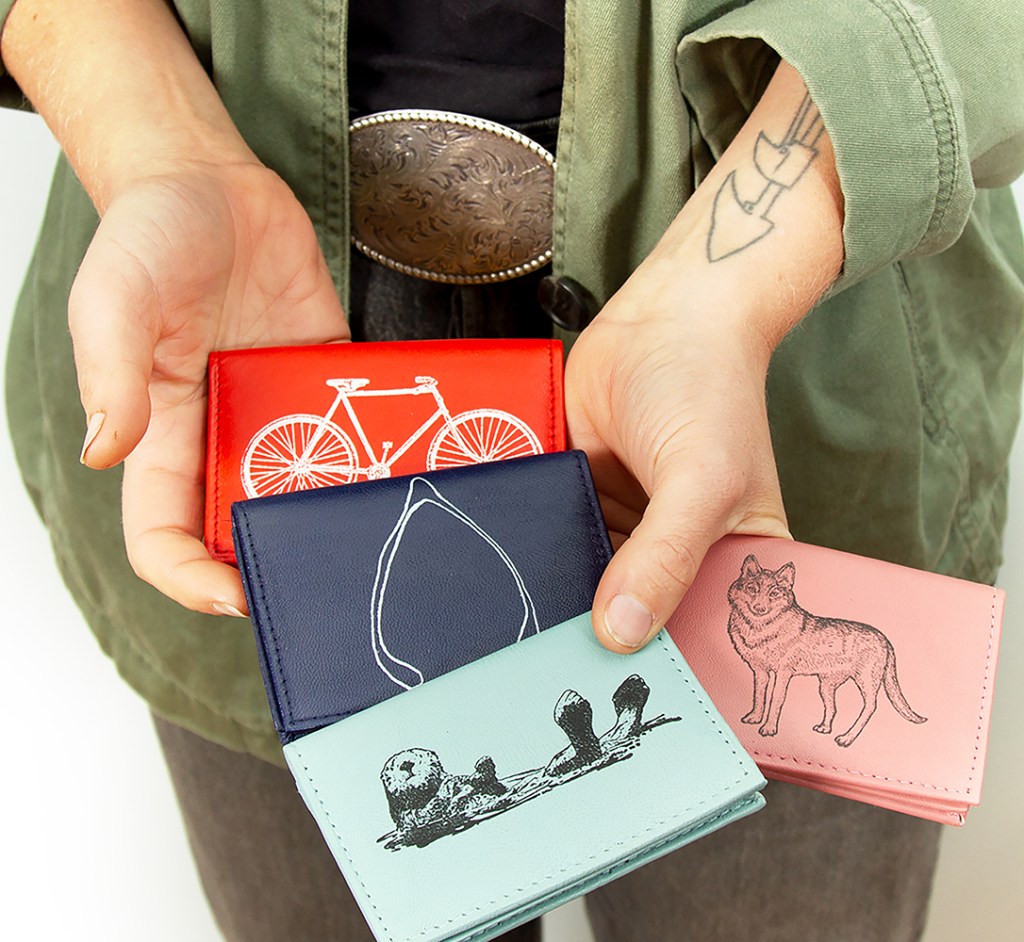 SHARA PORTER DESIGNS ✧ PRINTED LEATHER printed leather accessories with funny, quirky juxtapositions with imagery including animals, trees., flowers, bicycles, and simple decorative elements like arrows, anchors, and fleur-de-lis for men and women.